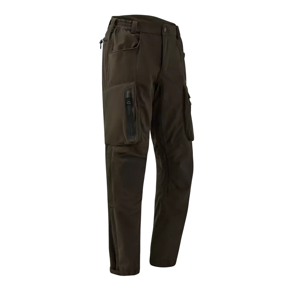 Hunt in all weather conditions. The trousers are both wind- and waterproof, as well as highly breathable due to the Deer-Tex® Performance Shell membrane, making them ideal for various weather conditions. The Game Pro Light trousers boast numerous features, including pockets with waterproof zippers, rubber prints on the knees for reinforcement, ventilation zippers and thin knee pads that are included.