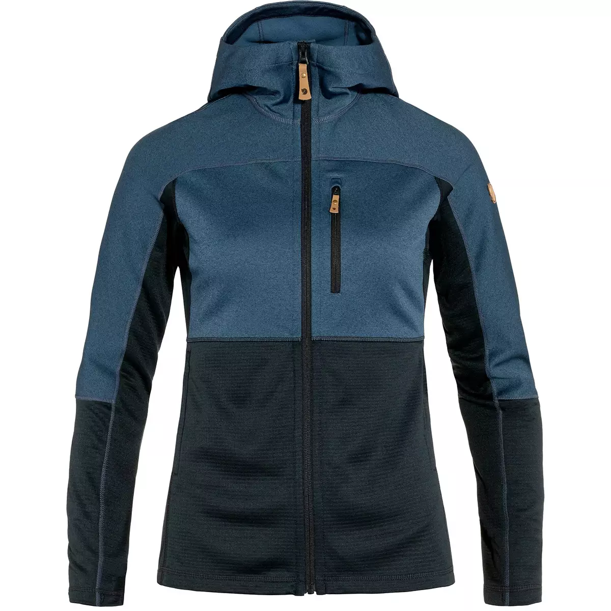 Light, convenient hooded sweater that combines two different fleece fabrics to warm where it is needed most and keep weight and packing volume down. The hood, shoulders and chest are made from flat-knitted polyester fleece (partially recycled) with a soft brushed inside, while the sides, lower torso and lower sleeves are in a lighter grid-structured fleece with superior ventilation. Perfect as a fast-drying and moisture-wicking mid layer on day trips or chilly summer evenings. Feminine, well-fitting cut and cosy hood with an opening for a pony tail. One-way zipper in front opening. One chest pocket and two hand pockets, all with zippers.