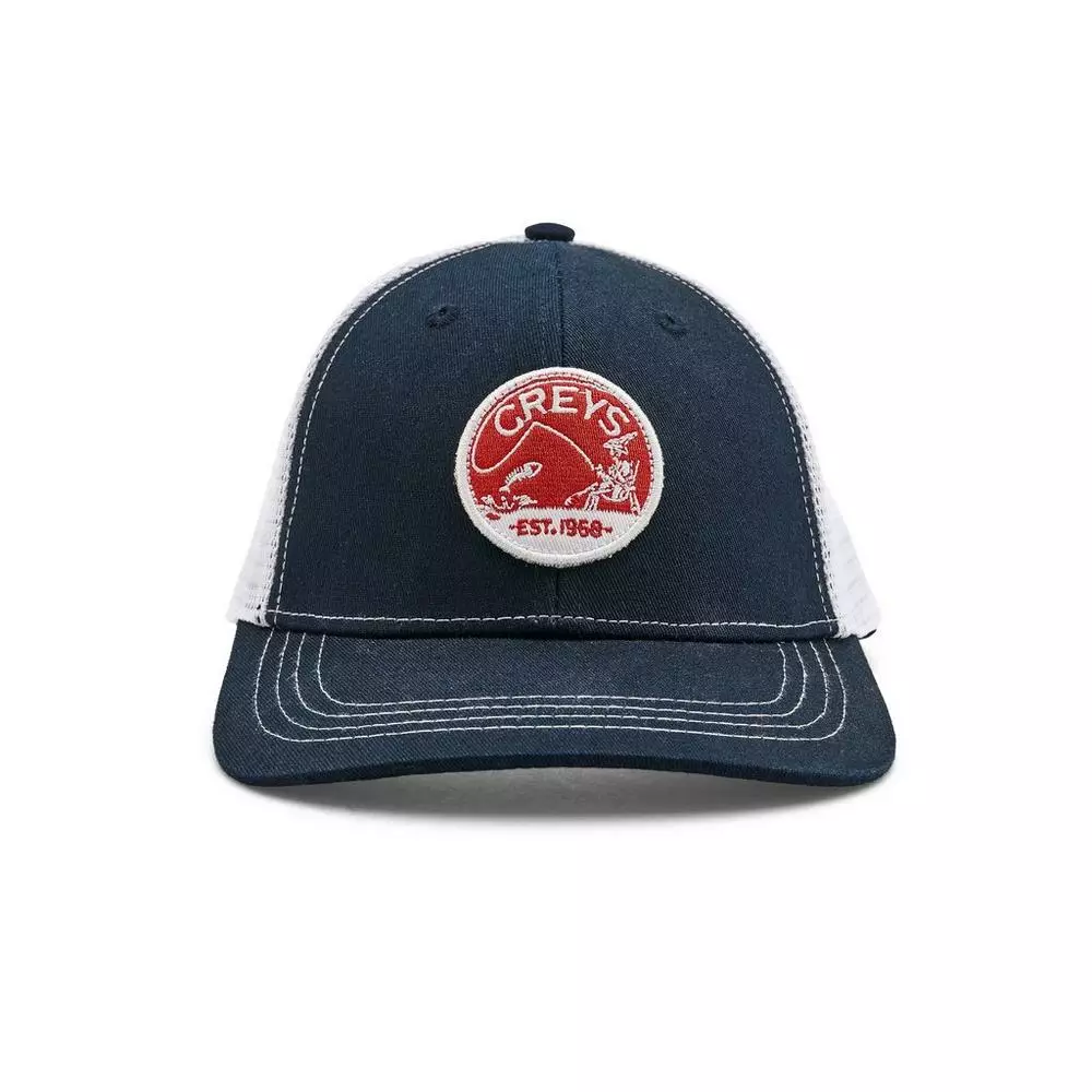 6 panel mid profile structured adjustable trucker hat featuring a woven label front graphic, and a dark undervisor to reduce glare.