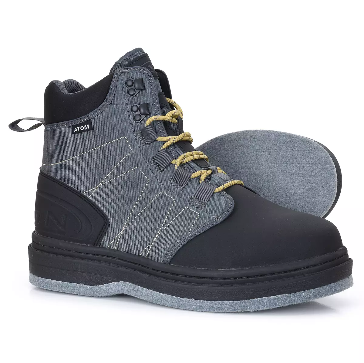 Atom is traditional fabric shoe and lightest in our range. Therefore, it is ideal for those who like to travel and for those who dont need the maximum support of their wading shoes. The front parts PVC material is there to take the hardest beating and together with the strong and sheltering EVA midsole they make this this shoe long lasting in normal use. - Very rigid overall design - Available with felt and Gummi soles - Can be studded with Vision Tungsten studs