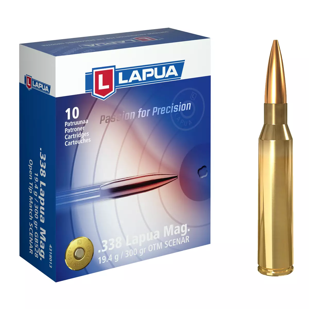 Lapua Scenar .338LM -kiväärinpatruuna, GB528 OTM -luodilla pitkän matkan tarkkuusammuntaan. 10 kappaleen rasiassa.