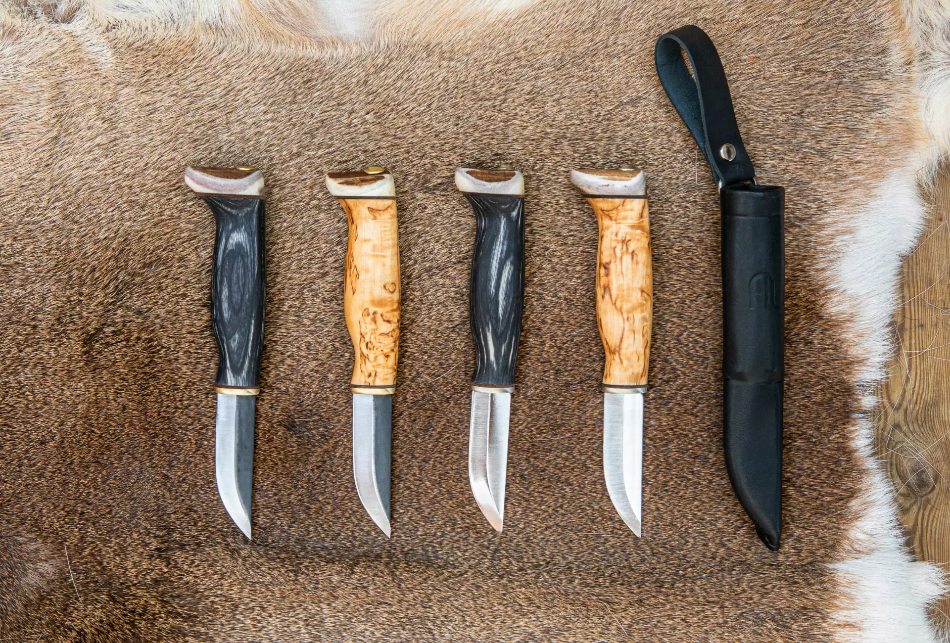 Each knife has details that make it unique, be it the pattern of the Finnish curly birch, or the irregular shape of the reindeer horn pommel. A sheath made of sturdy, Finnish leather protects the blade from weather and wear. Handmade in Finnish Lapland, up above the Arctic Circle, our knives are made with knowledge and craftsmanship – the legacy of Finnish knife making history.