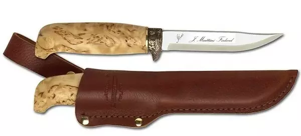 Erinomaiset käyttöominaisuudet yhdistettynä viimeisteltyyn ulkonäköön tekevät puukon käytöstä luksususta. Näyttävä visakoivukahva yhdistettynä upeaan pronssiseen sormisuojahelaan tekevät vuolemisesta juhlaa. Kaunis ruskea nahkatuppi kruunaa nautinnon.