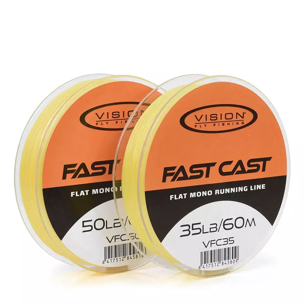 Fast Cast - Flat Mono Running Line. Fast Cast baby! The Fast Cast mono running line shoots through the guides without friction and it comes out of the water with the least resistance, making it popular running line for wide rivers and long casts. Its density is close to the water’s so you can achieve deeper depths than with floating running lines. It has very low stretch giving you the ultimate feel on your fishing and it has very low memory. Thanks to its thin diameter it doesn’t take as much room from your reel as the traditional running lines. Available in 35lb and 50lb, 60 metres per spool.
