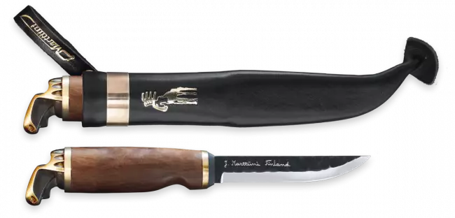 Muiden Marttiinin lahjapuukkojen tapaan tämä Kruunupääpuukko toimitetaan puisessa lahjalaatikossa.