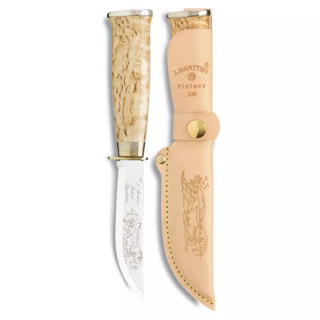 Tämä leuku on erinomainen yleispuukko, joka sopii niin eränkävijälle kuin metsästäjällekin. Ruostumattomassa kromiterästerä sekä tuppi on kuvioitu kauniisti perinteisin lappilaisin teemoin. Tupessa on lisäksi varma nepparikiinnitys.