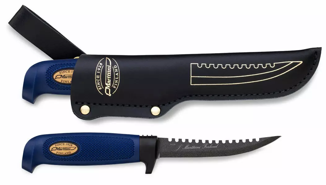 Martef-pinnoitetun kromiterästerän hamarassa olevalla hammastuksella suomustaminen käy helposti. Kalapuukon terässä on normaalin puukon teroitus, joten kalojen perkaamisen lisäksi vuoleminenkin onnistuu tällä puukolla loistavasti. Karhennettu kumikahva ja sormisuojahela takaavat pitävän otteen. Kalapuukossa on musta nahkatuppi.