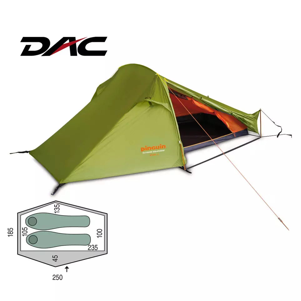 Erittäin kevyt kahden hengen vaellusteltta. Suuaukko yhdellä sivulla, jossa eteinen reppujen säilytystä varten.