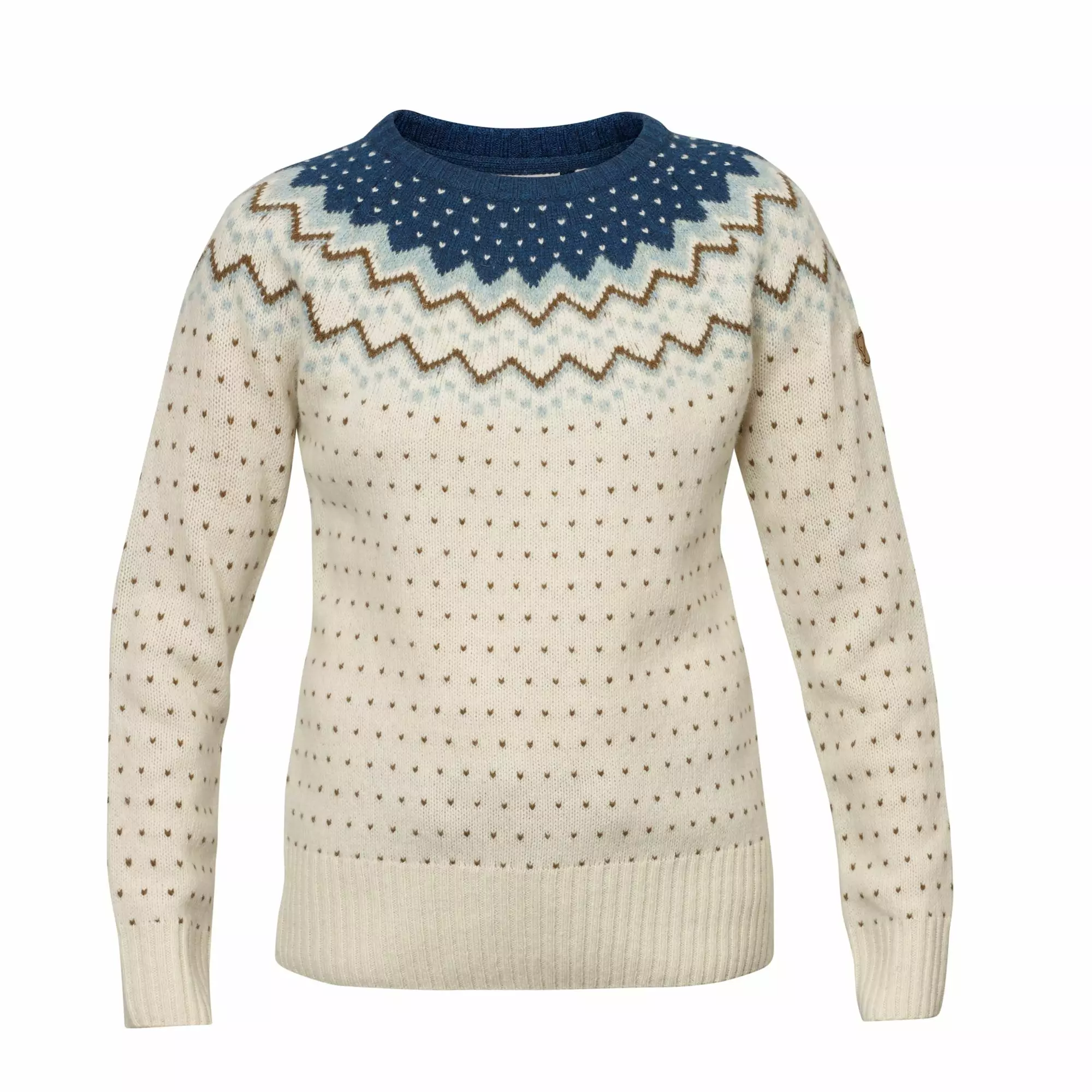 Kauniisti kuvioitu, pehmeä ja lämmin villapaita. Pyöreä kaulus, hyvin istuva raglan-leikkaus ja vahvikkeet kyynärpäissä.