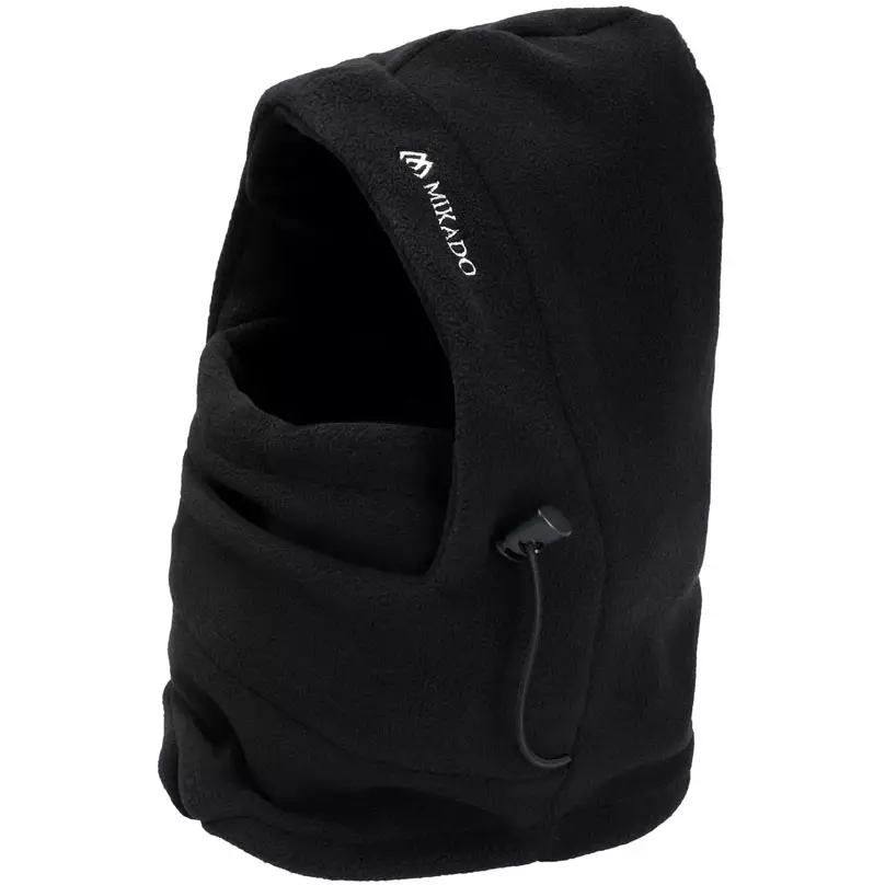 Warm and comfortable fleece balaclava. Trendy, black fabric with a stylish company branding.