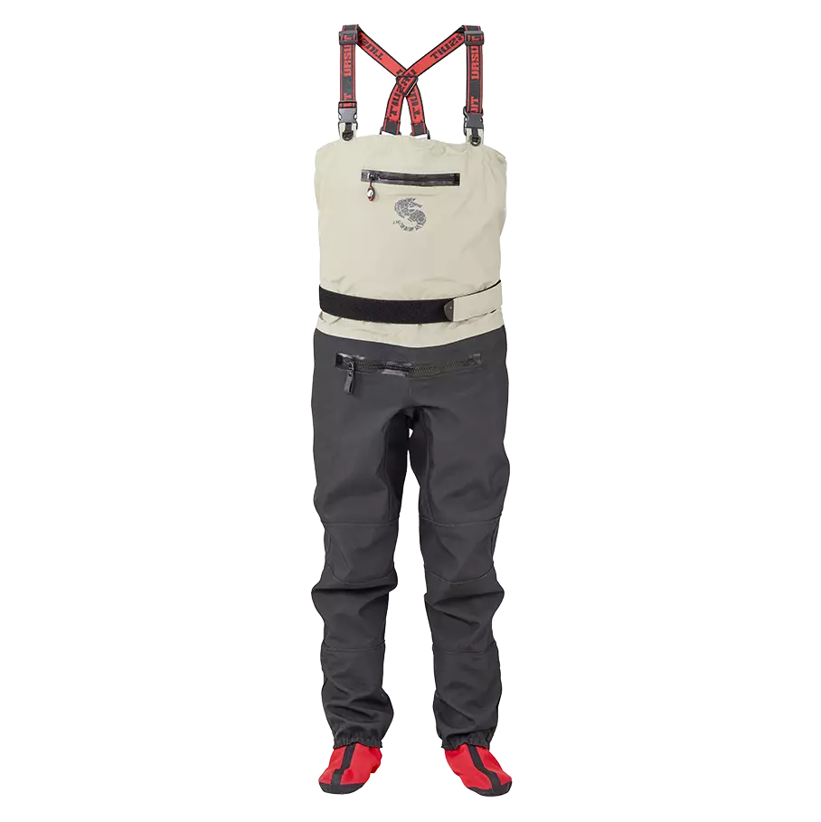 Lisäsimme kahluuhousuihin myös pelastuspuvuista tutun sepalusketjun. YKK:n 100% vedenpitävä sepalusketju on sijoitettuna kahluuhousujen haarukseen vaakatasoon. Tällä sepalusketjun asettelulla sen käyttäminen on helppoa ja nopeaa.
