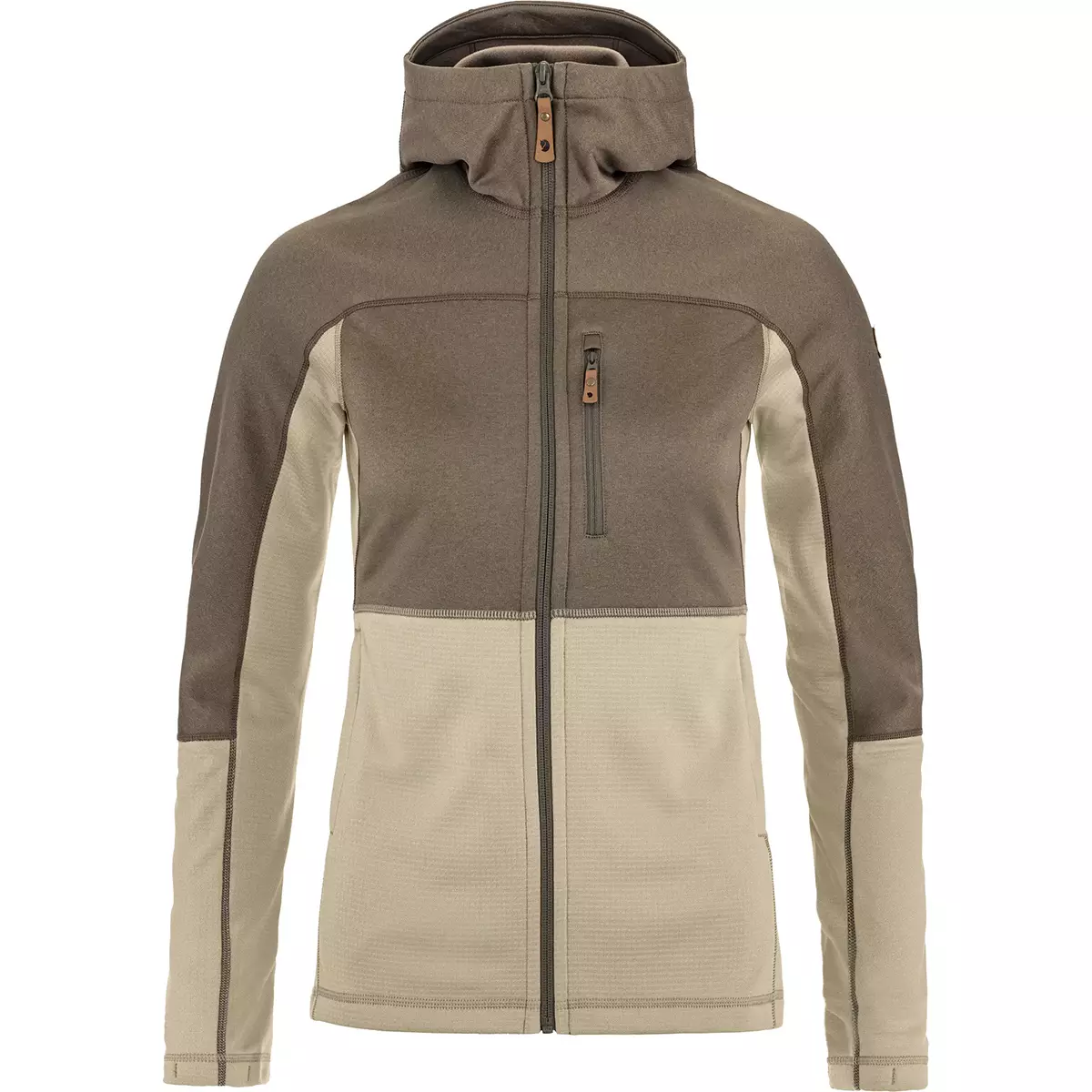 Lätt, smidig huvtröja som kombinerar två olika fleecematerial för att isolera där det behövs som mest samtidigt som vikt och packvolym hålls nere. Huva, skuldror och bröstparti är i slätstickad polyesterfleece (delvis återvunnet material) med mjuk borstad insida, medan sidorna, nedre delen av bålen och ärmsluten är i ett lättare, rutnätsmönstrat fleecematerial som ventilerar extra bra. Perfekt som snabbtorkande och fukttransporterande mellanlager på dagsturen eller under småkyliga sommarkvällar. Feminin, välsittande skärning och skön huva med öppning för hästsvans. Envägs dragkedja i öppningen framtill. En bröstficka och två handfickor, alla med dragkedja.
