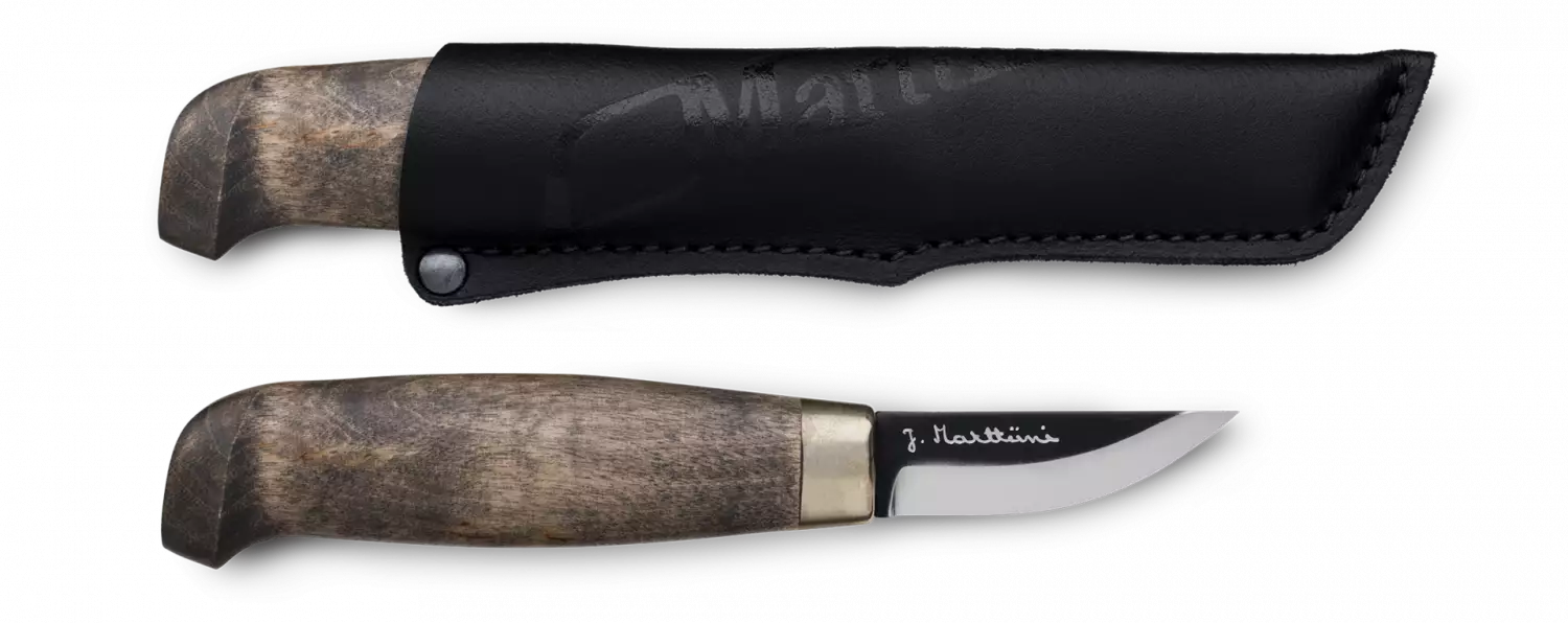 Det 6 cm långa kolstålbladet är praktiskt att använda och lätt att hålla skarpt. Handtagsformen följer det traditionella Marttiini Lynx-handtaget. Björkhandtag med vaxat finish ger dig ett bra grepp om kniven. Svart läderhölje med tryckt Marttiini-logotypmönster.