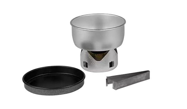 En kittel i aluminium 0,8 liter, lock/stekpanna Ø150 mm i non-stick, spritbrännare, vindskydd och tång.